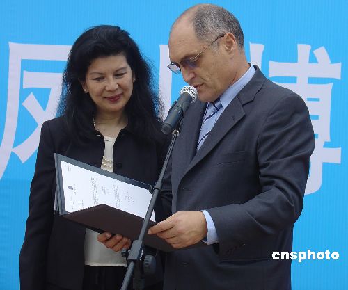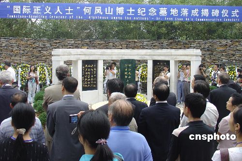 9月28日,在二战中挽救了数千名犹太人性命的中国外交官何凤山博士纪念墓地在湖南益阳落成揭碑,以色列驻华大使安泰毅、何凤山女儿何曼礼等均前往益阳深切缅怀何凤山博士。今年是享有“中国辛德勒”之称的国际正义人士何凤山逝世十周年,为完成父亲叶落归根的遗愿,何曼礼将其骨灰从美国接回,安葬于他的家乡湖南益阳。中新社发 肖前辉 摄