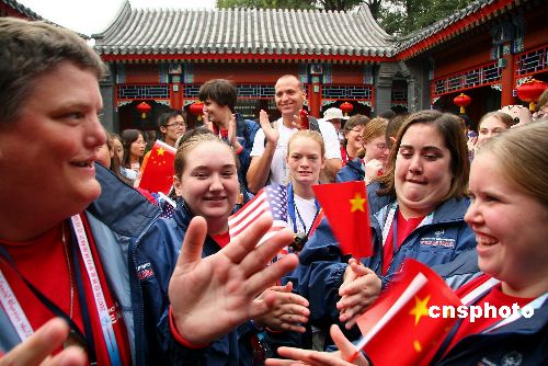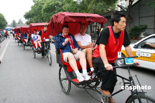 9月29日,特奥运动员进社区活动展开第二天的行程。当天,美国特奥运动员来到北京西城什刹海社区,坐三轮游览胡同,到社区活动中心参观,随后到居民家中共进午餐。中新社发 富田 摄