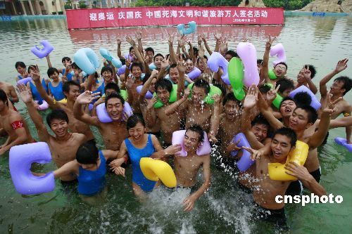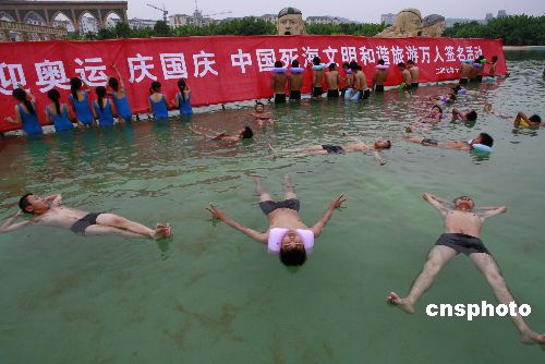 “十一”黄金周,位于四川省遂宁市大英县的中国死海旅游度假区内,几十名游客在室外漂浮池签名。国庆期间,死海景区开展一系列活动,倡导游客文明健康和谐旅游。中新社发 钟 敏 摄