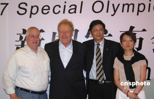 10月4日,2007年上海特奥会开幕式的部分主创人员集体亮相。开幕式总导演唐·米歇尔盛赞中国智障演员的表现,“特奥会开幕式表现的是智障人士个人的卓越,他们拿的是生活的金牌。”据悉,特奥会开幕式的美国版本目前已经制作完毕,并将于近日在美国的各大电视台播出。图左二是总导演唐·米歇尔。中新社发 李佳佳 摄