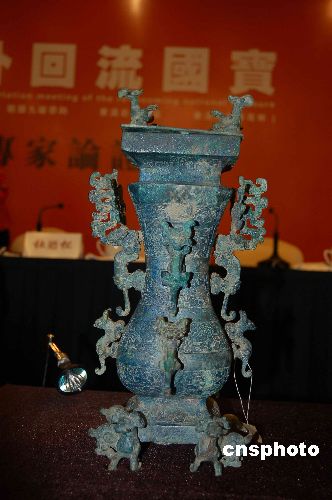 十月九日,精美程度堪称国内第一的“中华第一带钩”;底部铭文至今仍未破解的两件“光武帝刘秀御用漆器”;身世至今是个谜的青铜器四羊方壶等四件海外回流国宝今天亮相北京。来自海峡两岸的文物专家共同对国宝进行鉴定。据悉,总估价七千二百万元人民币的四件国宝是台湾中华文物学会从旅居海外多年的两位台湾收藏家手中征得,均系抗日战争之后从大陆流传到海外的。将于十一月十七日至十八日在皇朝•诚铭公司的二00七年秋季拍卖会中拍卖。中新社发 潘旭临 摄