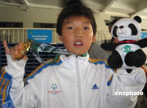 10月10日,上海特奥会上12岁的河南洛阳特奥运动员郭星星摘取男子50米A组金牌,他兴奋地举起奖牌,高兴地告诉所有人:“你行我也行!”中新社发 李佳佳 摄