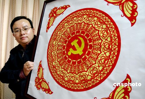 10月12日,中国剪纸协会会员、连云港一家公司的职员刘罡展示他创作的“喜迎十七大”剪纸作品。该作品中间部分的团花寓意祝贺党的十七大圆满成功。金色的党徽表示中国共产党的领导地位。从里向外顺序:第一层的心形代表全国人民万众一心拥护党;第二层的喜字代表全国人民满怀喜悦迎接十七大召开;第三层的牡丹花表示共建和谐社会,创造美好家园。中新社发 王健民 摄