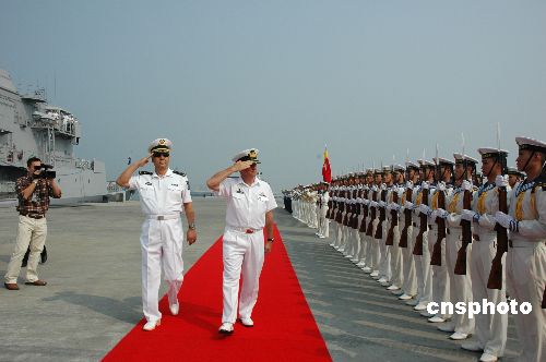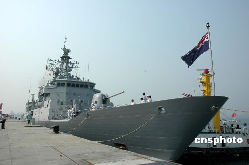 10月19日上午10时,新西兰海军“特卡哈”(Te Kaha)号护卫舰(舷号F77)在新西兰海上联合作战部队司令大卫·安森(David Anson)准将的率领下,驶抵中国海军湛江军港,开始对南海舰队进行为期3天的友好交流。中方南海舰队副参谋长么志楼少将在码头举行仪式,欢迎新舰首次访问湛江。中新社发 李根成 摄