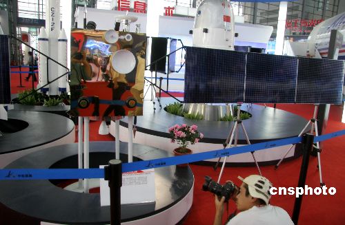 10月11日,“嫦娥一号”卫星模型在深圳高交会上亮相,因其是中国第一颗人造月球卫星并即将发射而备受关注。第九届深圳高交会将于当晚开幕。中新社发 孙自法 摄