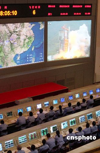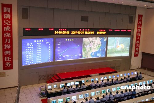 十月二十四日傍晚,中国首颗月球探测卫星——嫦娥一号发射成功。图为北京航天飞行控制中心监控卫星发射情况。中新社发 毛建军 摄