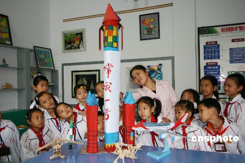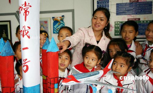 10月25日,“嫦娥一号”发射成功的消息传遍重庆永川区南郊小学校园,激发了学生们学习科技知识的热情。学校为此在校园开展了科普知识教育活动,向学生们介绍月球、探月卫星的知识,组织学生参观他们自己制作的“嫦娥一号”卫星模型。中新社发 陈仕川 摄