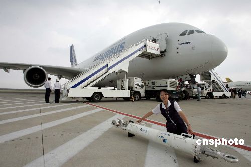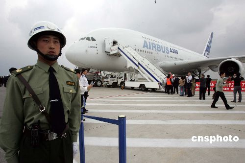 十月二十五日,空中客车A380飞机在上海浦东国际机场展示,据悉,这架生产序列号为007的A380是首度在上海公开其豪华客舱内饰。空客工作人员在此间表示,A380目前获得十六家客户的一百八十九架确认及承诺订单,○八年将交付十三架,○九年交付二十五架,到二○一○年,将年产四十架,而中国南方航空订购的五架A380计划在○九年下半年交付。中新社发 潘索菲 摄