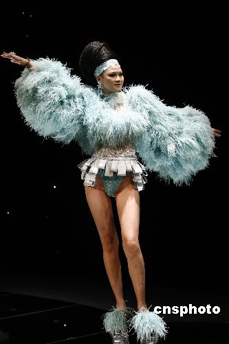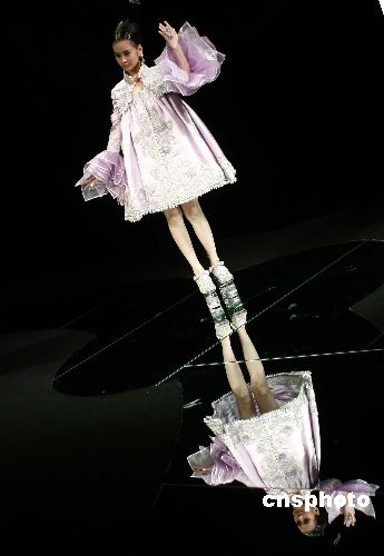 十一月三日晚,在北京举行的2007年中国国际时装周的舞台上,模特在梦幻般的舞台上展示设计师华丽的作品。中新社发 盛佳鹏 摄