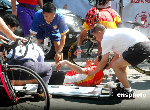 2007年11月6日,“海马汽车杯”环海南岛国际公路自行车赛进入第三赛段文昌——海口比赛。各国选手在历经总里程125公里后,快速冲刺设在海口市滨海大道的终点站时,一名在划线内的记者突然探头出来抢拍照片,结果被撞头破血流,相机摔破,而两名选手人仰马翻摔成重伤,另一选手被擦轻伤,当时的惊险场面引起观赛者一片惊呼声。中新社发 善平 摄