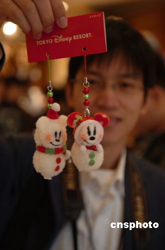 图为迪斯尼乐园推出今年的圣诞吉祥物“雪人一家”钥匙挂饰。