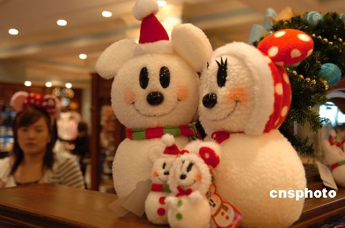 图为东京迪斯尼乐园中的特色礼物商店中的圣诞吉祥物“雪人一家”。