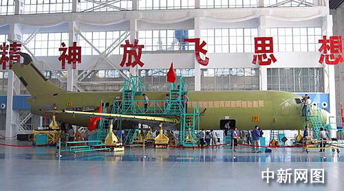 中国首架自主知识产权的喷气支线客机ARJ21正在总装中。