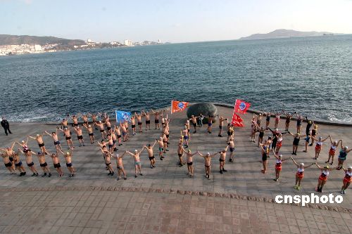 12月23日,山东威海冬泳协会组织近百名队员在海边举行“迎奥运冬泳健身”活动。据介绍,参加活动的人中最大年龄为75岁。中新社发 海云飞 摄
