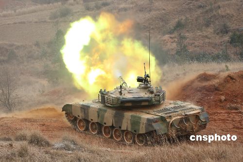 图为训练中,中方坦克分队对恐怖分子实施武力打击。