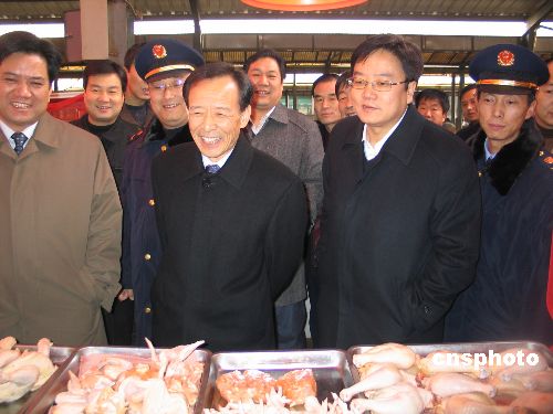 十二月二十八日,全国产品质量和食品安全专项整治行动验收组在西安抽查。图为国家质检总局副局长蒲长城(前排左二)检查0六七综合市场,与摊贩笑谈鸡肉价格。中新社发 冽玮 摄