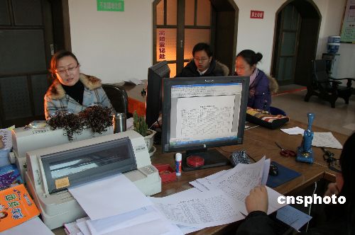 12月29日,山西阳城县民政局婚姻登记所工作人员在为准备新年结婚的青年登记忙碌。据阳城县婚姻登记所工作人员介绍,2007年12月份结婚登记的青年不少,最多时一天有27对青年登记。中新社发 马宏泰 摄