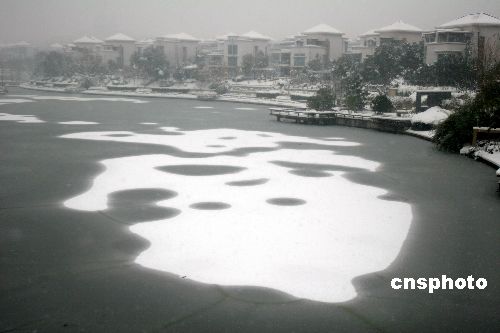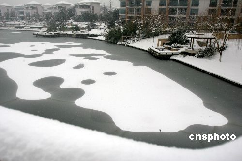 2008年1月27日,南京城南花神湖的冰面上,一幅幅图画般的“冰上雪”让许多市民啧啧称奇。南京连续的强降雪,给城南的花神湖披上了一件格外美丽的衣裳。中新社发 孙忠南 摄