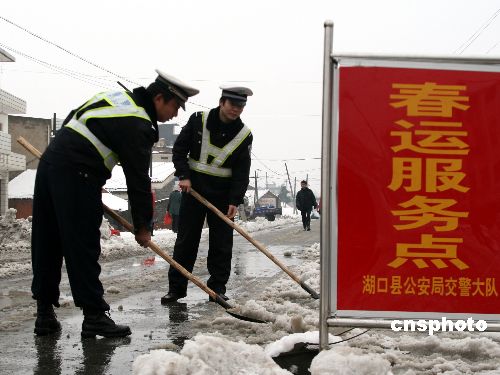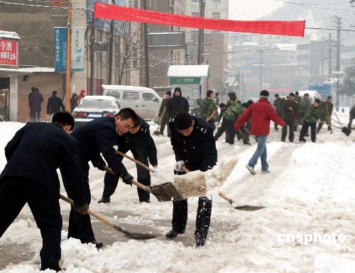 12月28日晚,江西省北部的湖口县迎来入冬以来最大的一场雪。据悉,该县已经连续六天发布道路结冰红色预警信号,所有道路凝冰严重。1月29日,凝冰未化又遇小到中雪,通行能力受到挑战。该县民警、消防战士、驻地部队官兵、民兵应急队员和广大党员干部群众二万余人上街清扫积雪和凝冰,尽最大努力减少灾害损失。中新社发 张 俊 摄