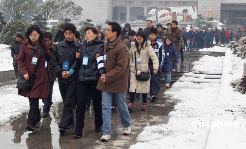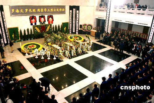 为保护湖南电网而牺牲的湖南电力公司罗海文、罗长明、周景华三烈士追掉会,1月30日在长沙阳明山殡仪馆举行,上千群众前往悼念。湖南省委常委、长沙市委书记陈润儿,省人大常委会副主任陈叔红,省人民政府副省长陈肇雄,省政协副主席阳宝华,省军区副政委万建华等省领导前往悼念。图为湖南各界沉痛悼念抗冰保电的三位烈士。中新社发 殷中民 摄