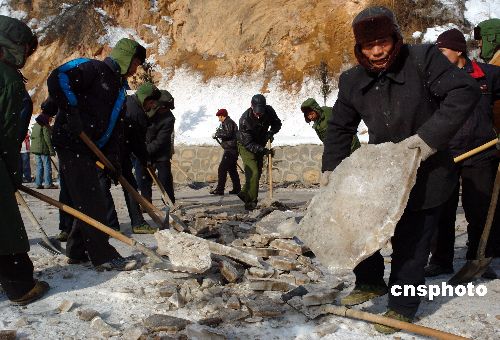 2月4日至5日,陕西凤县机关干部和黄牛铺镇群众共1000余人,出动4台大型机械,清理212省道秦岭路段的冰雪,确保春运畅通。中新社发 王健 摄