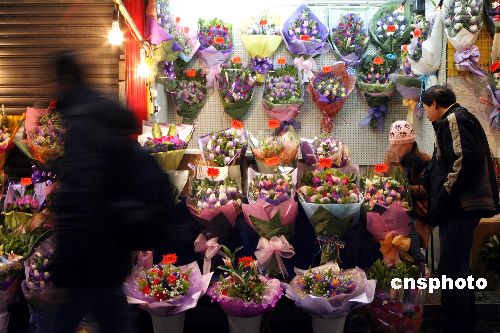 二月十三日,一位市民走过香港街头的鲜花摊档。情人节前夕,香港各鲜花店生意开始昌旺。中新社发 武仲林 摄