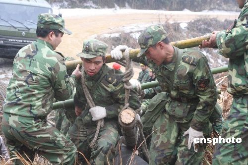 2月17日,成都军区某红军师高炮团士兵增援贵州省黔东南电网建设,他们紧急投入到110千伏天锦输电线路的抢修,力争在2月21日通电。2月15日,成都军区某红军师高炮团500名增援官兵驰援抵达贵州省黔东南苗族侗族自治州凯里市,他们将分赴黔东南州的三穗、天柱、锦屏、黎平等4县受灾点进行增援,昼夜抢修受损电网,以尽快恢复灾区供电。中新社发 姚瑶 摄
