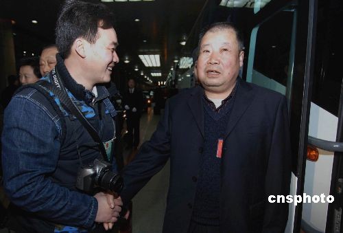 三月二日清晨六时余,有“皇帝作家”之称的十一届全国人大代表、历史小说家凌解放(笔名“二月河”),随河南代表团乘火车抵京,出席即将于五日开幕的第十一届全国人大一次会议。图为他在火车站接受中新社记者采访。 中新社发 王东明 摄