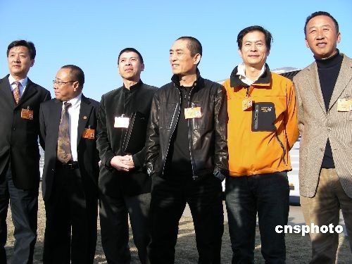 三月三日下午,全国政协十一届一次会议开幕会后,著名导演张艺谋委员和他在北京电影学院的同学委员们相聚,在大会堂前合影。图中左起至右分别是:张会军、尹力、冯小刚、张艺谋、陈国星和冯小宁。其中,张会军是北京电影学院院长,其余五人均为中国著名导演。中新社发 沈嘉 摄