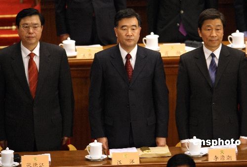 3月3日下午,全国政协十一届一次会议在北京人民大会堂开幕,中共中央政治局委员李源潮、汪洋、张德江(从右至左)出席。中新社发 任晨鸣 摄