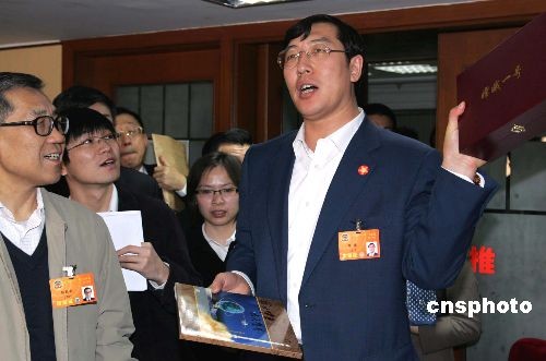 三月四日,在全国政协小组讨论会上,政协委员、亿阳集团董事长邓伟向委员们赠送“嫦娥一号”模型。中新社发 潘索菲 摄