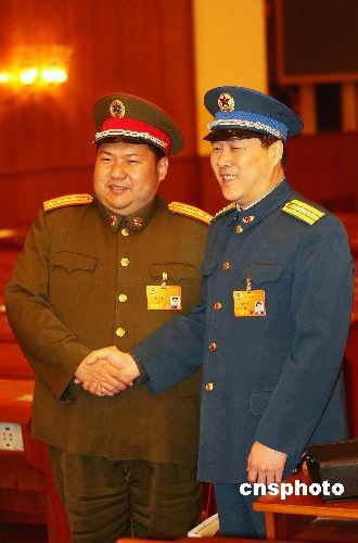 三月八日上午,全国政协十一届一次会议第二次全体会议在北京人民大会堂举行。毛泽东之孙、解放军军事科学院战争理论和战略研究部研究员毛新宇出席,与朱德的孙子——空军指挥学院副院长朱和平握手并合影。中新社发 盛佳鹏 摄