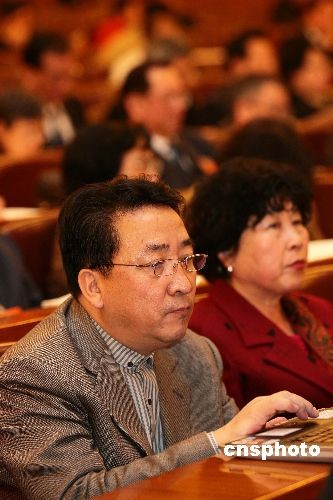 三月九日,全国政协十一届一次会议第三次全体会议在北京人民大会堂举行,中国文联主席团委员、中国曲艺家协会副主席姜昆委员(左)参加会议。中新社发 盛佳鹏 摄
