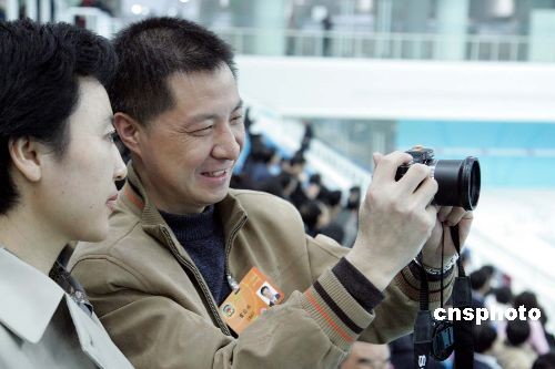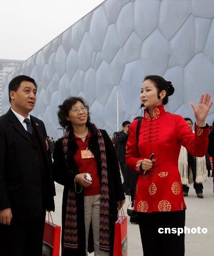 三月十二日下午,部分全国政协委员参观北京奥运场馆。图为委员们在国家游泳中心“水立方”参观。中新社发 潘索菲 摄