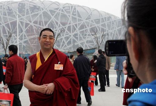 三月十二日下午,部分全国政协委员参观北京奥运场馆。图为全国政协委员、青海省佛教协会副会长拉茂赛赤活佛,在北京奥运会国家体育场“鸟巢”前请人拍照留影。中新社发 潘索菲 摄