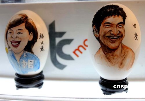 近日,香港世贸中心以奥运为主题,配合传统民间艺术举办“复活蛋艺展”,给香港观众带来充满特色的蛋艺展览。三部分二百件的彩绘蛋画、蛋雕和卵石画作品栩栩如生。图为奥运金牌风云人物田亮、杨文意蛋雕。中新社发 洪少葵 摄