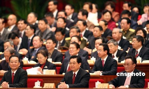 图:胡锦涛、吴邦国、温家宝出席政协闭幕会