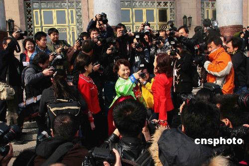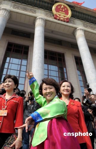 3月14日上午,全国政协十一届一次会议完成各项议程后在北京人民大会堂闭幕。朝鲜族委员李承淑兴高采烈走出会场,在大会堂前载歌载舞欢庆大会圆满闭幕。
