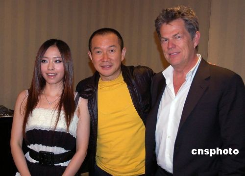3月19日下午,著名华人作曲家谭盾与美国著名音乐制作人大卫·福斯特、“超女”张靓颖在北京亮相,向媒体介绍由他与大卫·福斯特共同创作、张靓颖和世界著名盲人歌唱家安德烈·波切利主唱的北京奥运会候选主题歌《拥抱爱的明天》。据悉,谭盾为了创作这首歌,用了八年时间进行构思,经过十八次修改,最终于今年春节大年初一在美国洛杉矶录制完成。这首歌曲堪称是中西文化相互融合的精典作品之一,并于三月十日北京奥运会主题歌征集的最后一天送交北京奥组委。中新社发 潘旭临 摄