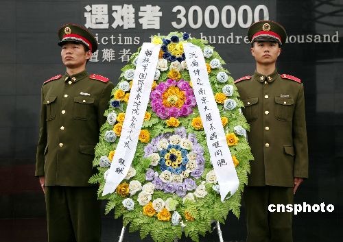 3月30日,解放军战士向南京大屠杀遇难同胞敬献花圈。清明节临近,众多南京市民和外地游客来到侵华日军南京大屠杀遇难同胞纪念馆,以各种方式吊唁遇难同胞。中新社发 钟山 摄