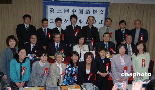 由日本侨报社日中交流研究所主办的“第三届日本人汉语征文比赛”颁奖典礼暨获奖作品集《寄语奥运寄语中国》首发仪式,3月28日下午在东京日本外国记者俱乐部举行。中国驻日使馆于淑媛总领事代表崔天凯大使,日本民主党众议院议员菊田真纪子、内阁府副官房长官大野松茂自民党众议院议员代理日本外务省地域调整官井尻和宏、日中友好会馆理事长村上立躬、日本财团理事长尾形武寿等各界人士80余人参加。图为参加颁奖典礼的获奖者和嘉宾合影。 中新社发 段跃中 摄