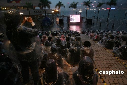 图为观众在雨中观看影片。中新社发 武仲林 摄