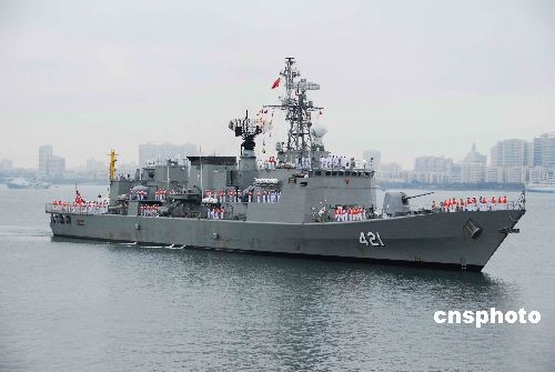 4月1日下午,由泰国皇家海军学院参谋长巴桑·苏卡斯特少将率领的泰国海军舰艇编队在中国海军舰艇引导下,冒着细雨驶入湛江港。这是泰国军舰首次访问湛江。中新社发 韩海冰 摄