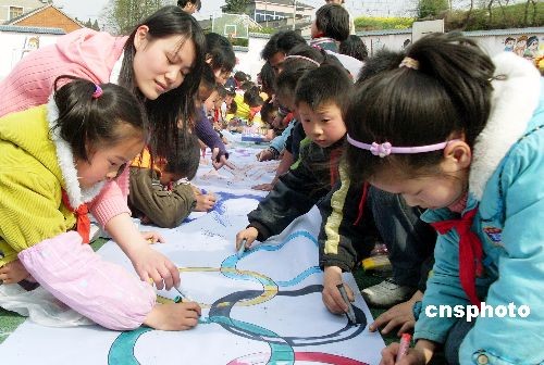 4月2日,江苏大学人文学院50多名大学生走进镇江市七里甸中心小学,与该校学生一起开展“大小学子共绘奥运画卷”活动,学子们在百米长卷上共同绘制了奥运福娃、五环标志和各类运动项目等图案,表达他们对北京奥运会的期盼和祝愿。作者: 石玉成