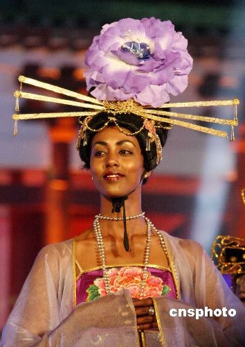 4月1日晚,2008国际旅游小姐总决赛“迪斯科皇后”单项决赛晚会在河南洛阳举行。来自世界115个国家的115位佳丽参赛,在晚会现场4位不同肤色的佳丽当场“秀”起了中国传统服饰--唐装。中新社发 曾宪平 摄
