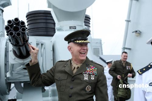 4月2日,美国海军陆战队司令詹姆斯·康威上将一行开始对中国南海舰队进行为期2天的参观访问。南海舰队副参谋长么志楼少将下午陪同康威上将前往湛江军港,登上中国海军“武汉”号导弹驱逐舰和“罗霄山”号登陆舰参观。康威兴致勃勃地参观了舰艇指挥作战室、驾驶室和舰载武器等核心部位,听取了解说员对舰艇有关性能的介绍。康威对中国军队的开放程度、透明程度和现代化程度表示称赞。图为康威上将参观“武汉”号导弹驱逐舰30炮,该军舰是中国自行设计建造的新型现代化军舰。中新社发 李唐 摄