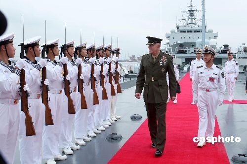 图为康威检阅“罗霄山”号登陆舰仪仗队。中新社发 李唐 摄