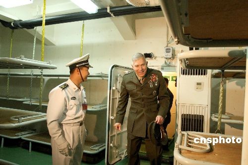 图为康威参观“罗霄山”号登陆舰登陆兵舱,该军舰是中国自行设计建造的新型现代化军舰。中新社发 李唐 摄