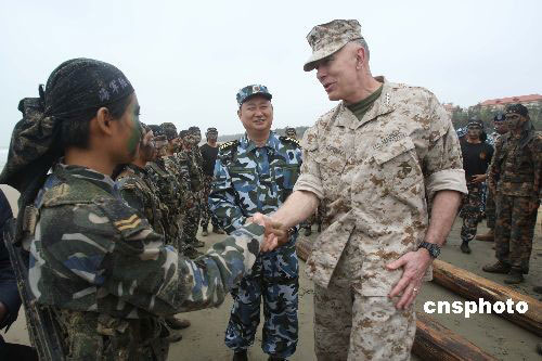 4月3日,美国海军陆战队司令詹姆斯·康威上将一行在中国海军南海舰队野外两栖登陆训练场,观摩中国海军陆战队某旅的军事演练和海军某部的反恐演练。图为康威问候中国女陆战队员。中新社发 李唐 摄