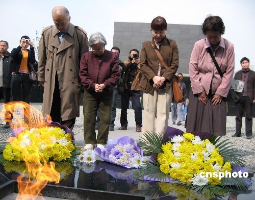 4月4日清明节,在侵华日军南京大屠杀遇难同胞纪念馆祭场内,日本铭心会友好访华团团长松冈环(右二)、旅日华侨中日交流促进会秘书长林伯耀(左一)等百名日中友好人士抔土献菊,祭扫南京大屠杀三十万遇难者。中新社发 朱晓颖 摄